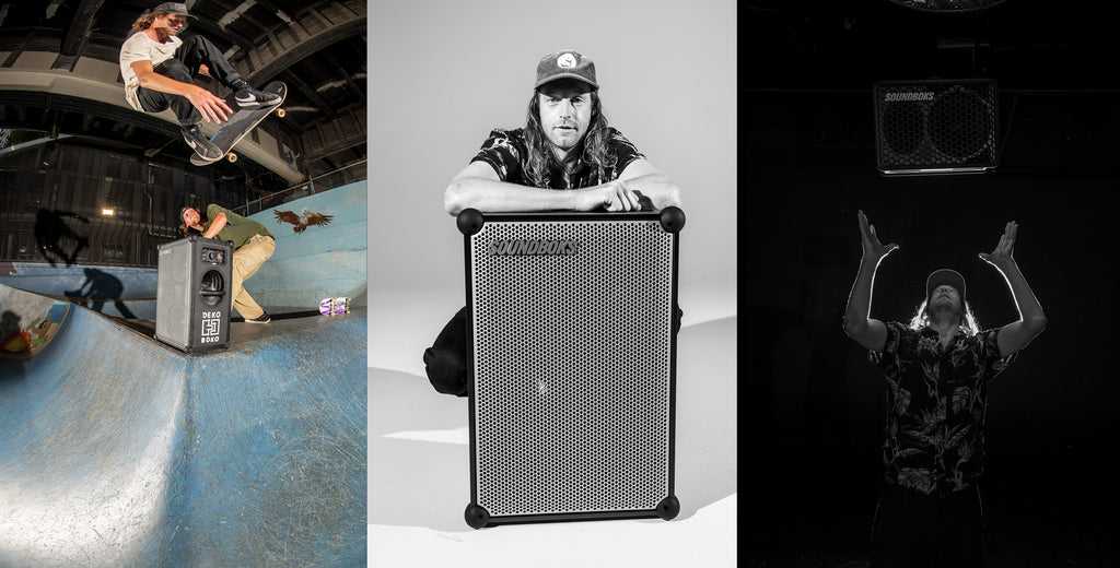 Skateboarder Willis Kimbel first discovered SOUNDBOKS during a trip to Copenhagen’s Meatpacking District. As he walked past a building, he heard the walls vibrating. Intrigued, he followed the sound to see one standing in the corner of the room blasting bangers.